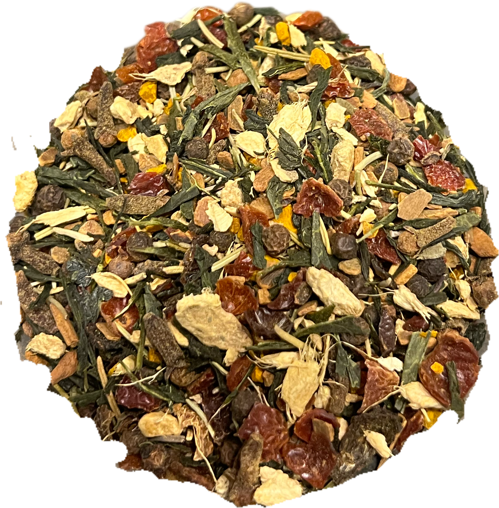 Sencha* (Camellia Sinensis), Ginger Root (Zingiber Officinale), Cinnamon Chips (Cinnamomum Cassia), Tumeric Root* (Curcuma Longa), Black Pepper (Piper Nigrum), Cloves* (Syzygium Aromaticum), Rosemary* (Rosmarinus Officinalis), Holy Basil (Ocimum Basilicum), Rose Hips (Rosa Canina). (*Organic)