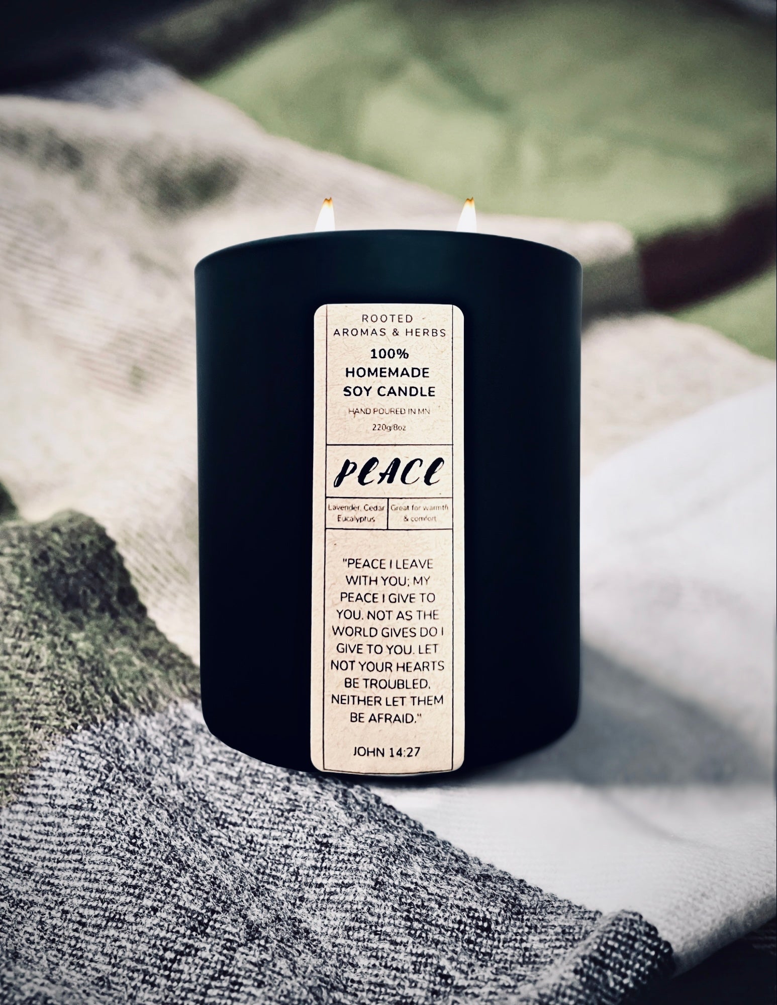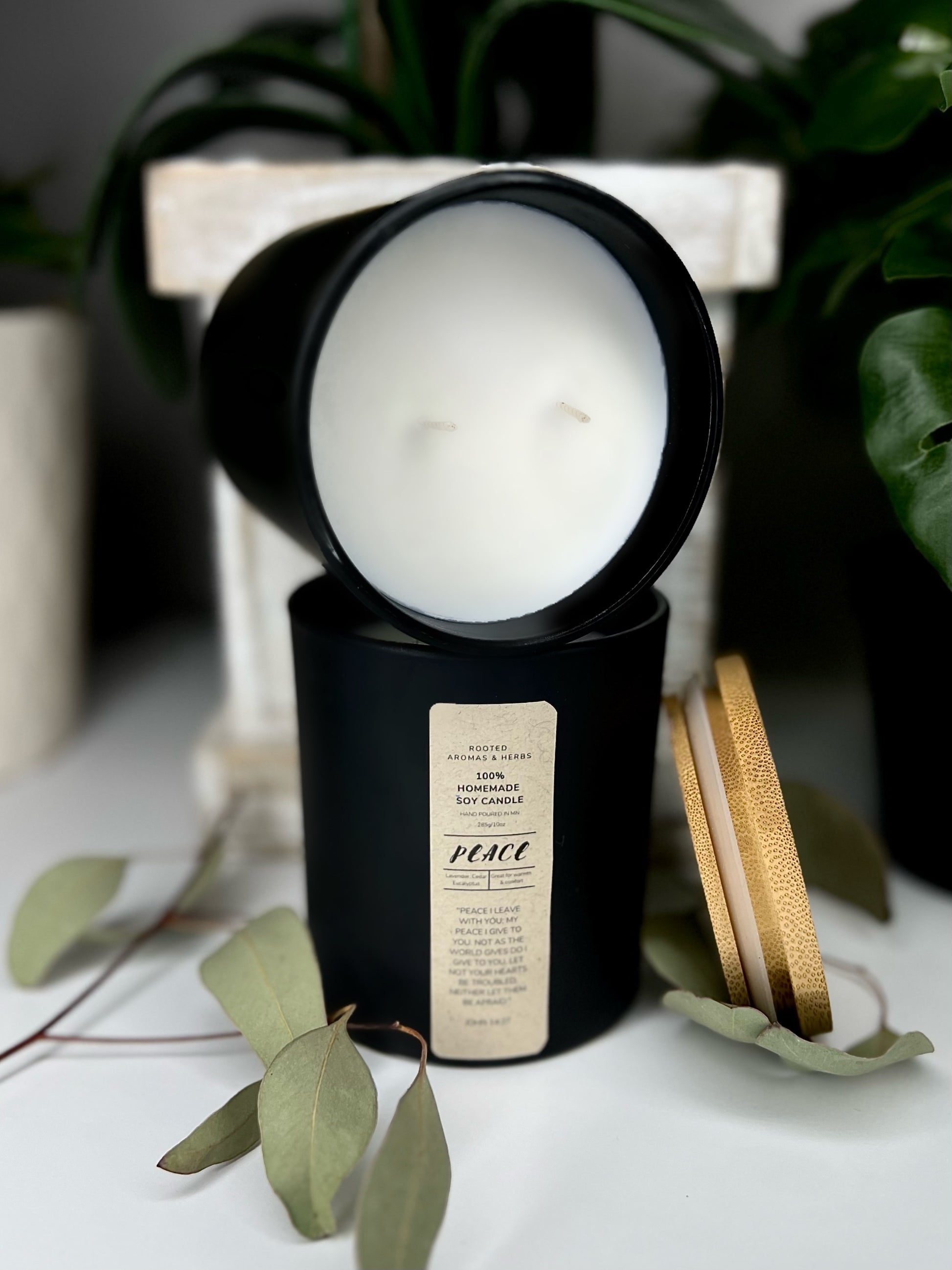 The “Peace Candle” comes double wicked encased in a 10oz matte black jar with a wooden lid. This aesthetic adds a touch of elegance and natural beauty to any space.